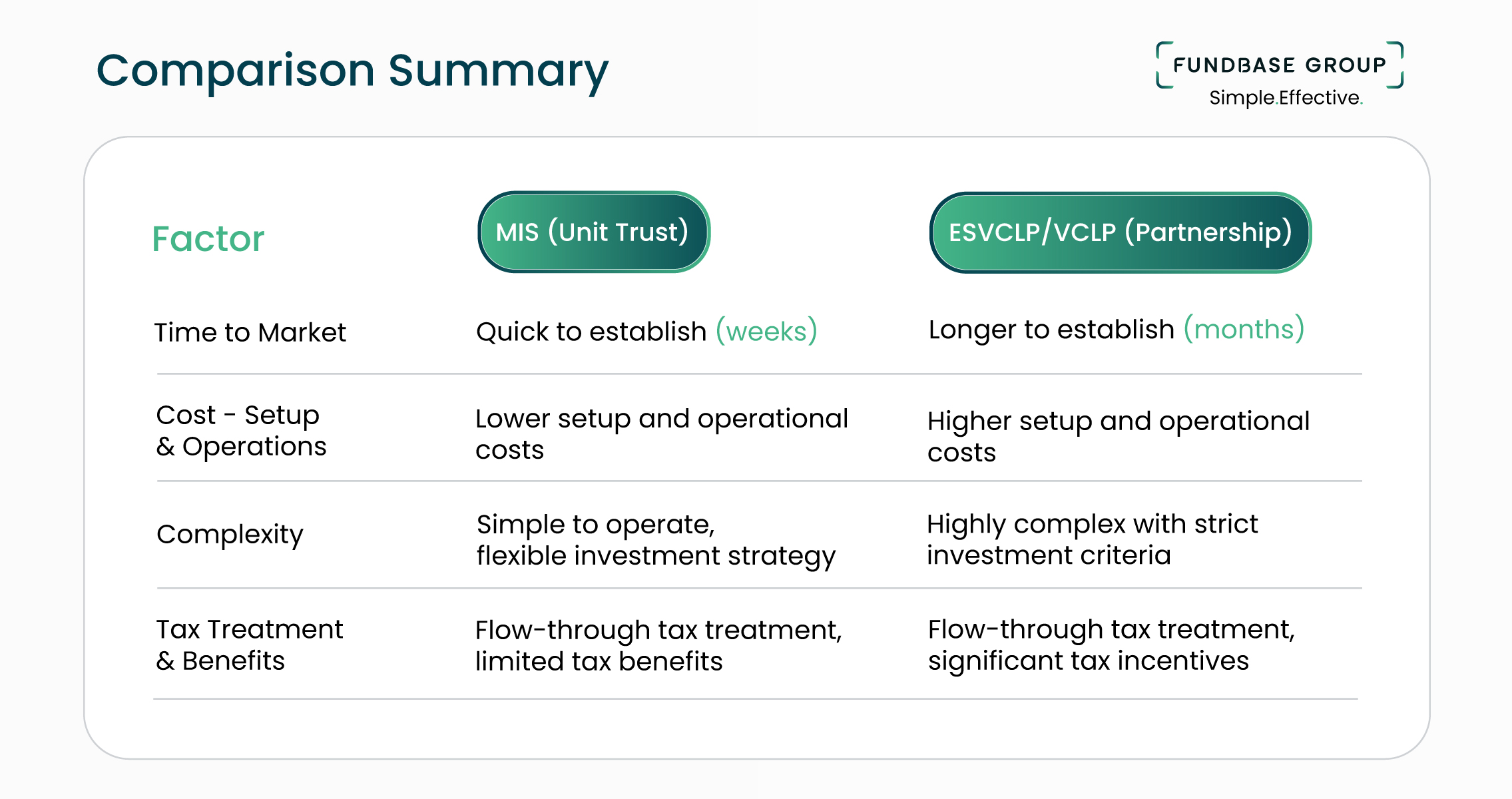• Lower Setup Costs: The MIS structure is relatively cost-effective to establish, especially compared to more complex structures like ESVCLPs. The legal and regulatory costs involved in setting up a Unit Trust are significantly lower.